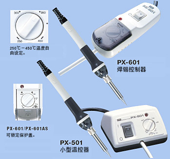 精确温度管理、易操作、高可靠性及高性价比,最新设计抗菌硅胶手柄(除AS系列)。快速升温至设定温度。 温度校正旋钮,以便供焊嘴或发热芯交换后,温度校对用。规格 型号 PX-501 PX-601 PX-501AS PX-601AS 额定电压 110V, 220V AC 50/60Hz 耗电量 85W 电烙铁电压/功率 110V, 220V AC / 80W 温度设定范围 250—450ºC 250—450ºC 发热芯 陶瓷发热芯 温度控制方式 传感器反馈( ON-OFF控制) 绝缘电阻(500V DC) 100MΩ以上 尺寸 电烙铁 全长195mm 本体 85(L)×100(W)×57(H)mm 130(L)×48(W)×31(H)mm 重量 电烙铁 41g(除电源线) 本体 266g(除电源线) 75g(除电源线) Ripple Temp. without Load ±3ºC 漏电电压 0.1mV以下 地线电阻 0.3Ω以下 电烙铁至控制器线长 1.2m 电源线长 1.5m (3芯、带地线插头)